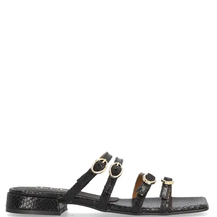Sandalia escotada con multi tiras en piel grabada símil serpiente. Mini tacón ancho de 1 cm de altura. Tiras ajustables con hebilla.
