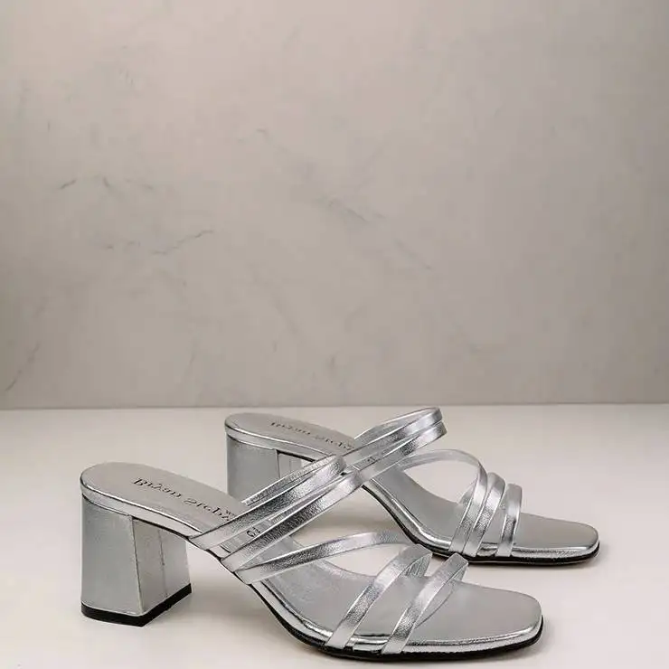 Sandalia de tacón con finas tiras simétricas de piel. Plantilla acolchada en piel. Tacón ancho de 6,5 cm de altura.