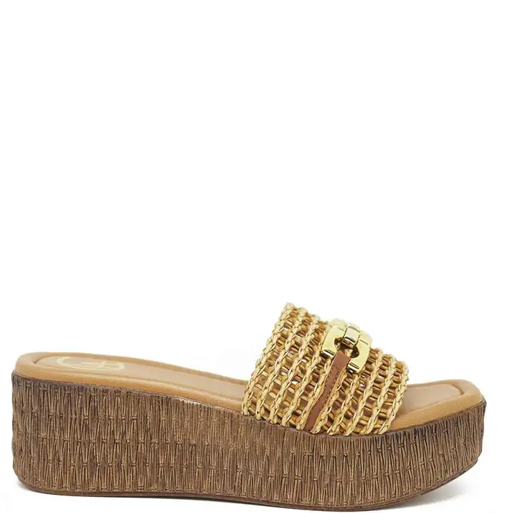Sandalia de plataforma con pala de cuero calado. Detalle de eslabón metalizado en el empeine. Suave plantilla acolchada. Suela de plataforma de 4 cm de altura.