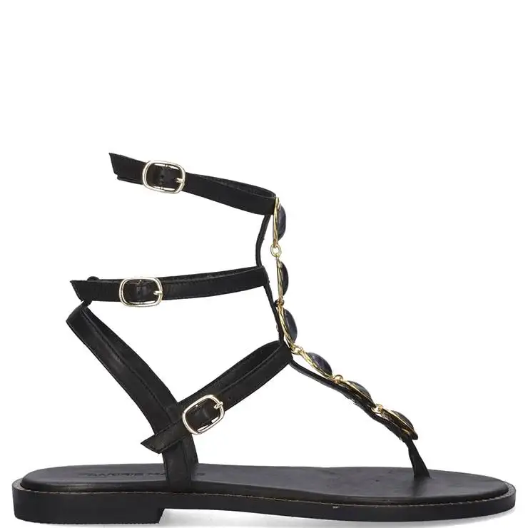 Sandalia plana tipo romana de multitiras en piel. Suela en material sintético. Detalle de pedrería en la tira central. Cierre ajustable con tres hebillas.