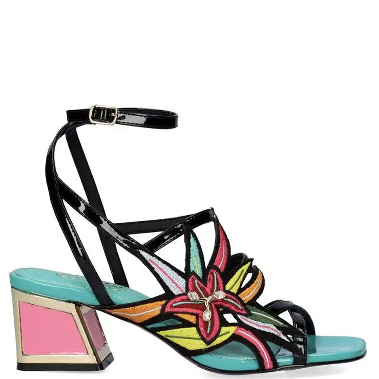 Sandalia en color negro con diseño floral multicolor y adorno con brillantes. Corte y suela son de material sintético y la plantilla de piel.