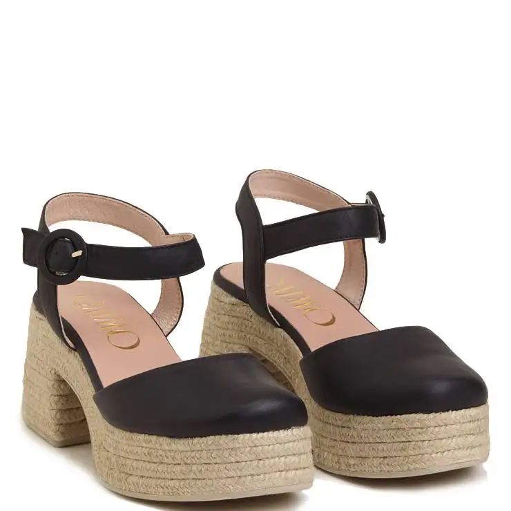 Sandalia tipo alpargata elaborada en piel napa suave. Punta cerrada y talón abierto. Cierre ajustable con hebilla forrada al tono. Plantilla acolchada de piel. Tacón ancho de yute ecológico de 8 cm y plataforma de 3,5 cm de altura.