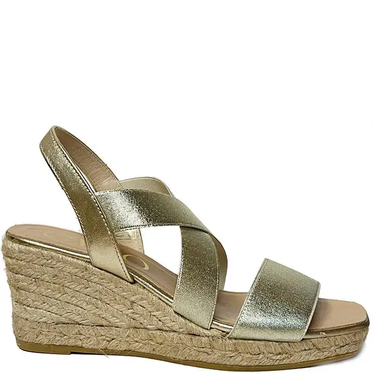 Sandalia elaborada en napa metalizada. Tiras cruzadas elásticas en el empeine. Cuña de yute de 5 cm de altura.