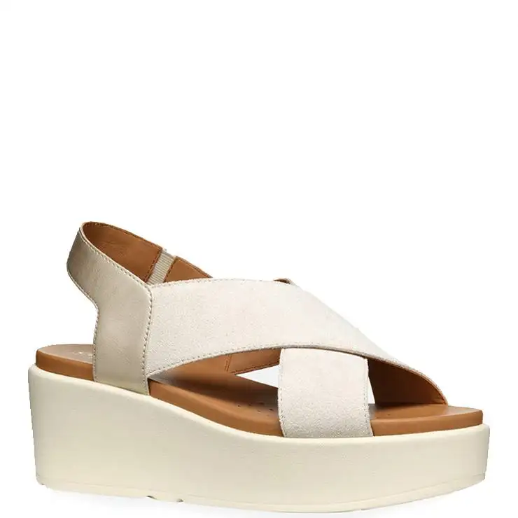 Sandalia de cuña con tiras cruzadas de gamuza y material efecto piel perlada. Transpiración de la suela gracias al sistema ideado por Geox. Suela de goma de 4 cm de altura. Ajuste con elástico en la parte trasera para facilitar el calce.