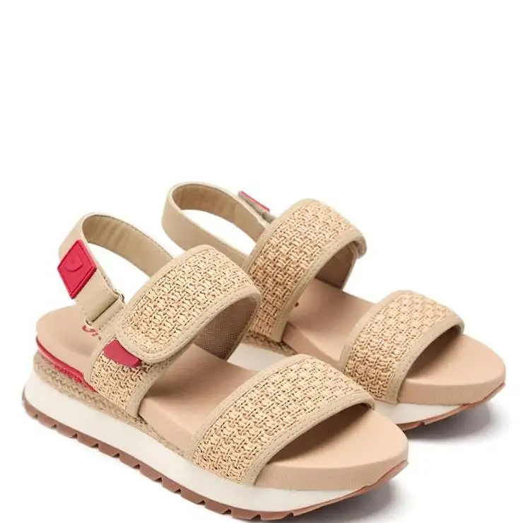 Sandalias deportivas con rafia. Planta anatómica. Forro y planta de poliuretano. Cierre ajustable con velcro en el empeine. Suela de goma EVA de 3,8 cm. Patín dentado de TPR.
