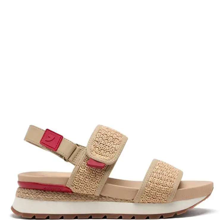 Sandalias deportivas con rafia. Planta anatómica. Forro y planta de poliuretano. Cierre ajustable con velcro en el empeine. Suela de goma EVA de 3,8 cm. Patín dentado de TPR.