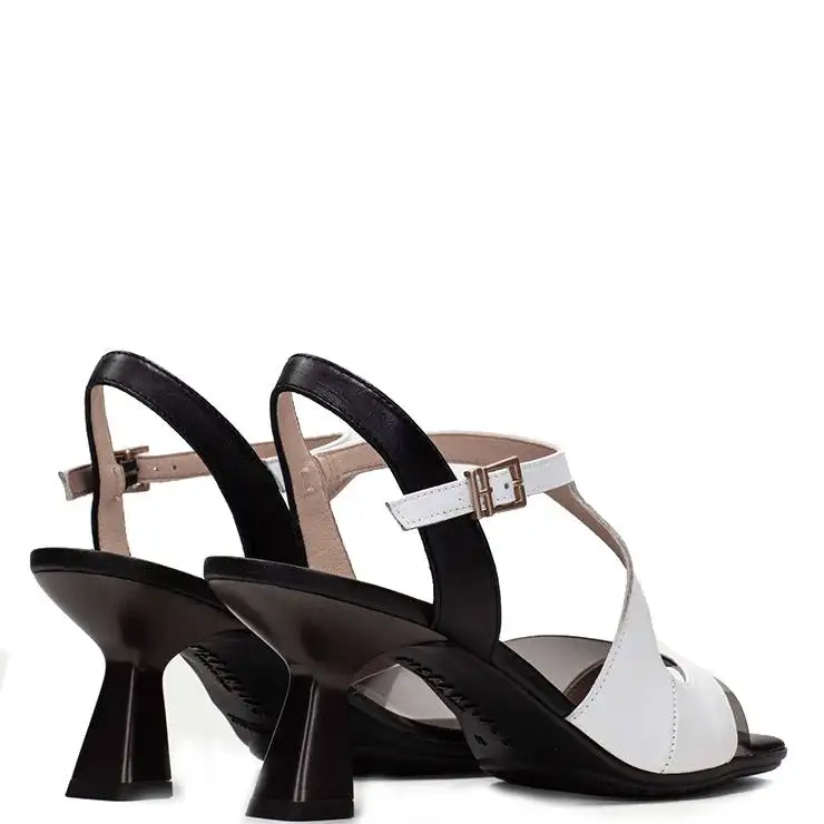 Sandalia elaborada en vinilo y piel bicolor. Cierre de hebilla en el tobillo. Tacón fino de 6,5 cm de altura. Plantilla con tecnología Triple Quilted Triflow. Suela antideslizante de Poliuretano TP.