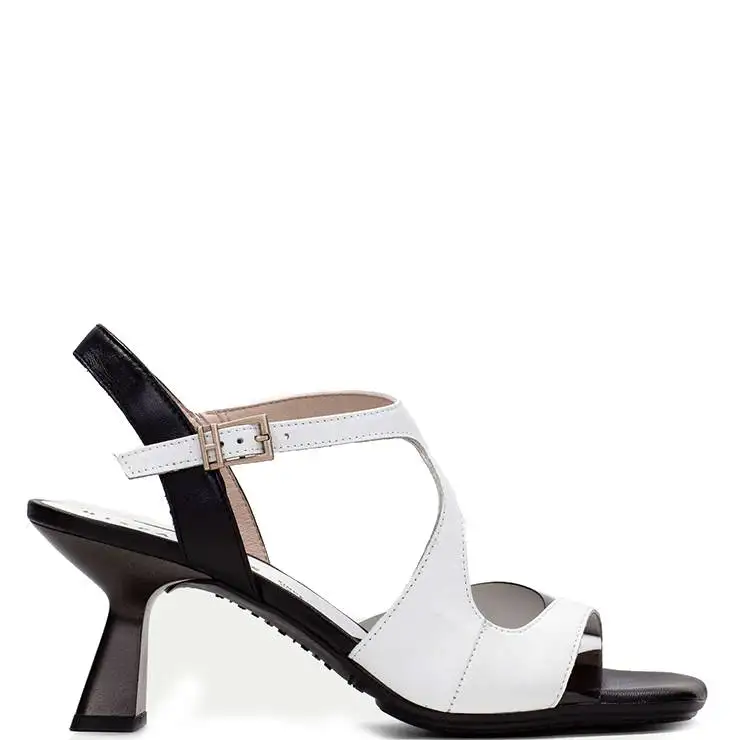 Sandalia elaborada en vinilo y piel bicolor. Cierre de hebilla en el tobillo. Tacón fino de 6,5 cm de altura. Plantilla con tecnología Triple Quilted Triflow. Suela antideslizante de Poliuretano TP.