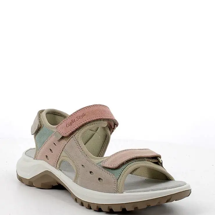 Sandalia estilo casual con tiras en ante multicolor en tonos pastel. Cierre ajustable con tres velcros. Suela de goma antideslizante. Plantilla anatómica de cuero.