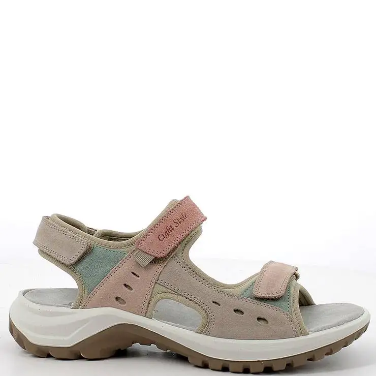 Sandalia estilo casual con tiras en ante multicolor en tonos pastel. Cierre ajustable con tres velcros. Suela de goma antideslizante. Plantilla anatómica de cuero.