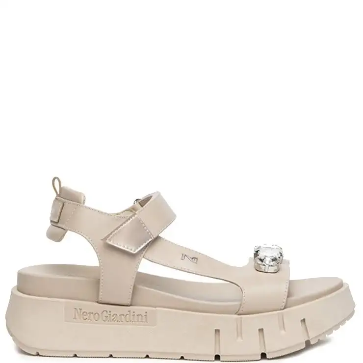 Sandalia elaborada en piel y material técnico. Detalle de pedrería. Suela de goma con plataforma de 4 cm de altura. Cierre ajustable con velcro.