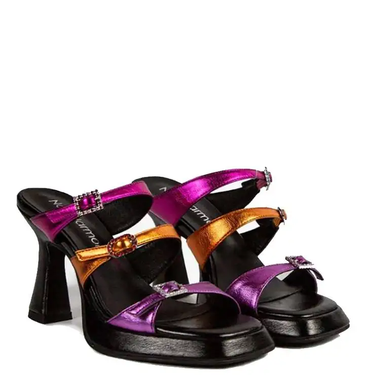 Sandalia de tiras multicolor y acabado metalizado. Detalle de hebilla con brillantes. Tacón de 9 cm de altura y plataforma de 2 cm en color negro. Suela de goma.