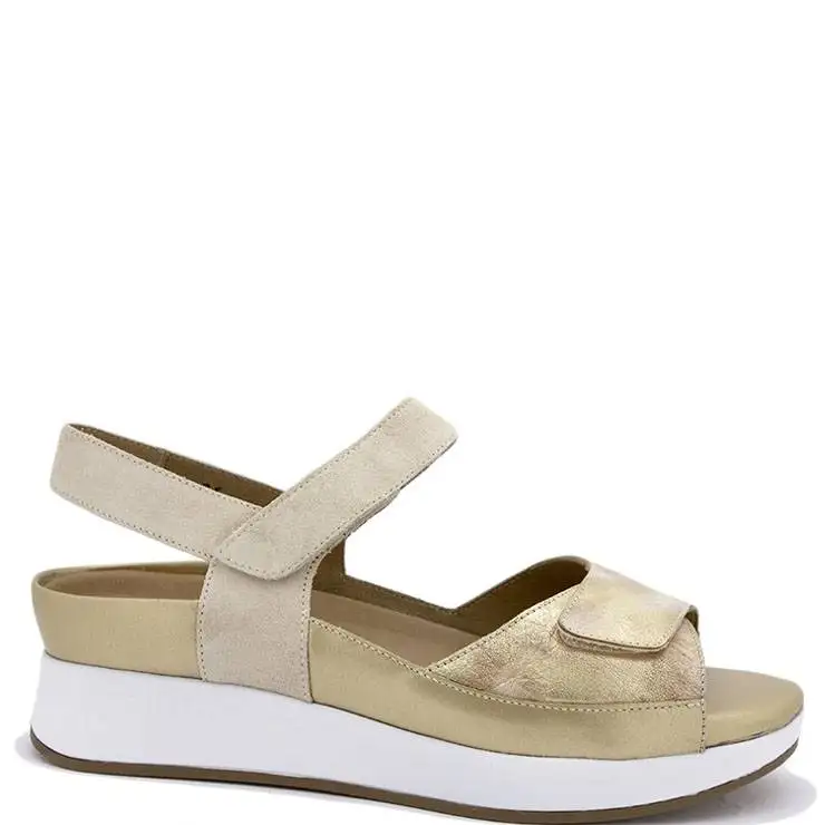 Sandalia elaborada en piel. Plantilla extraíble. BiFlex extra grueso. Suela de goma de 4 cm de altura. G-Safe (revestimiento antiviral y antibacteriano). Cierre ajustable con doble velcro.
