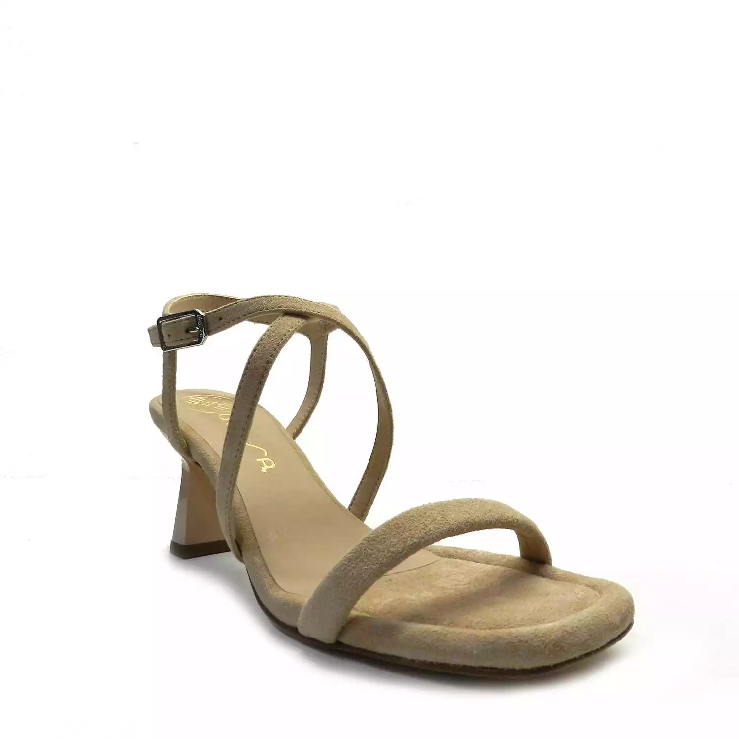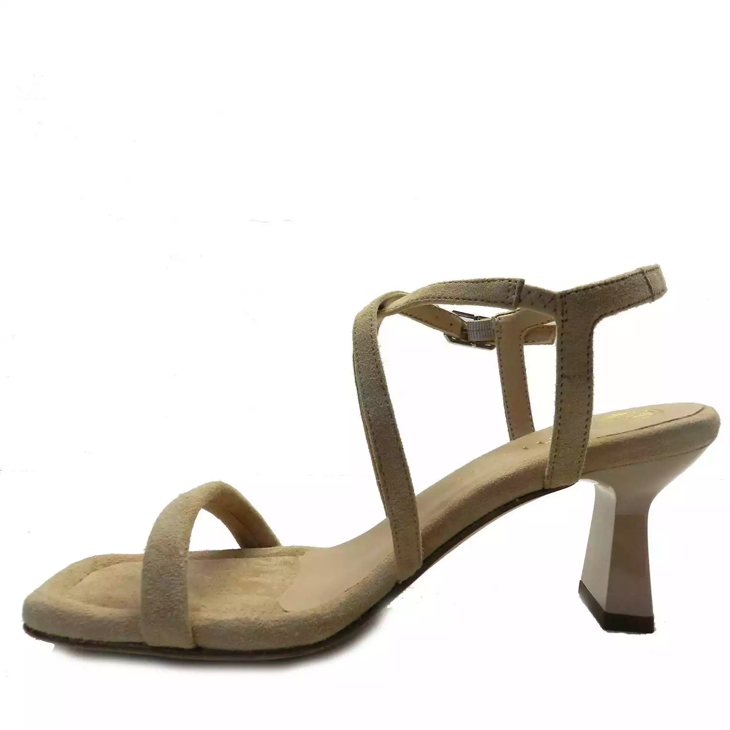 Sandalia de la marca Unisa, modelo Mancil en color beig. Sandalia de finas tiras elaboradas en ante. Cierre ajustable mediante hebilla metálica. Tacón geométrico pintado al tono de 6.5cm y suela de cuero color natural.