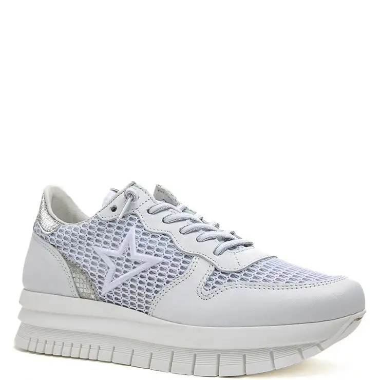 Zapatilla deportiva con plataforma elaborada combinando rejilla y piel. Detalles metalizados. Cierre con cordones y logo de estrella en el lateral. Suela de goma con plataforma de 3 cm de altura.