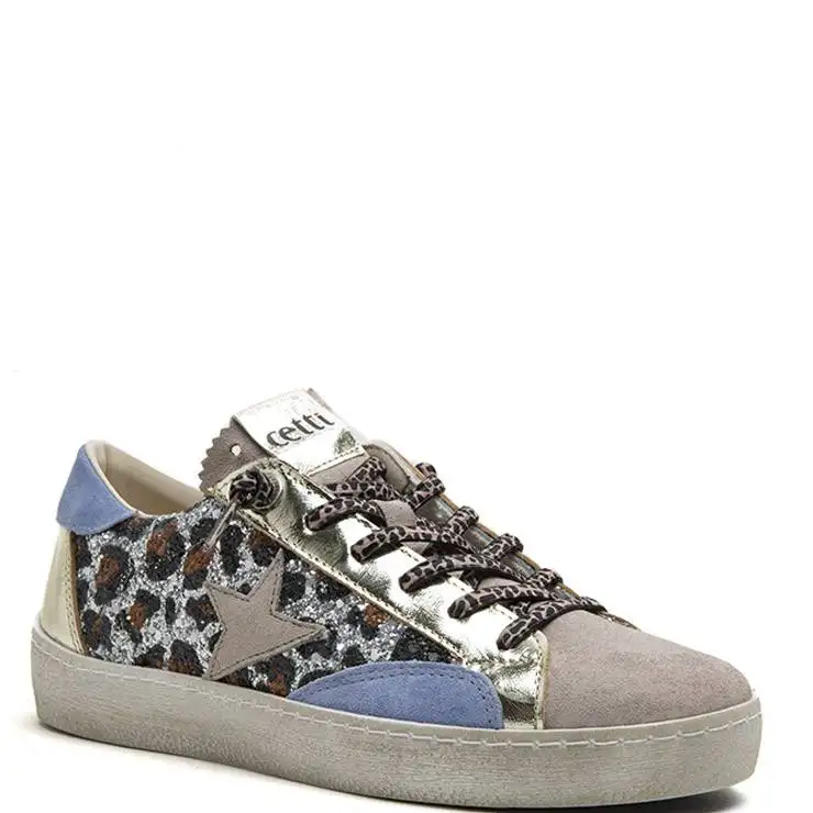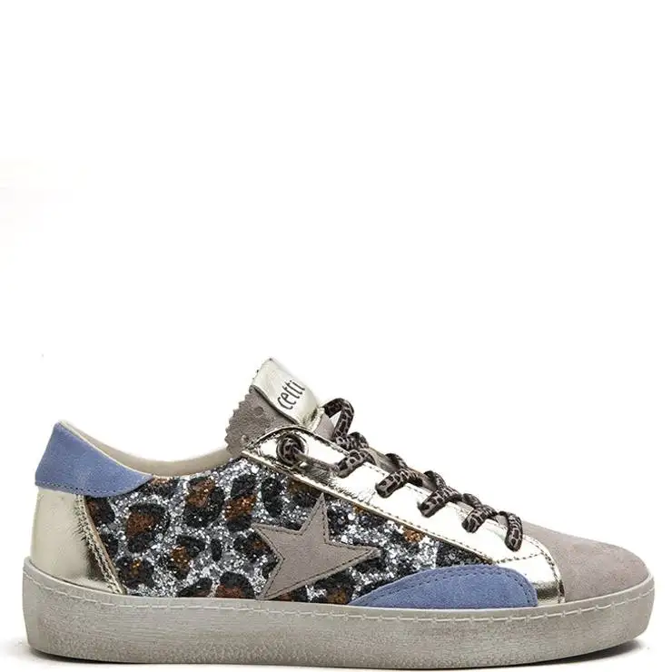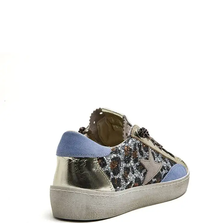 Zapatillas deportivas elaboradas en ante azul y beig con glitter leopardo. Suela de goma de 1,5 cm de altura. Cierre cordones elásticos.