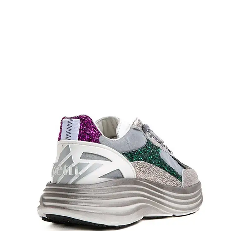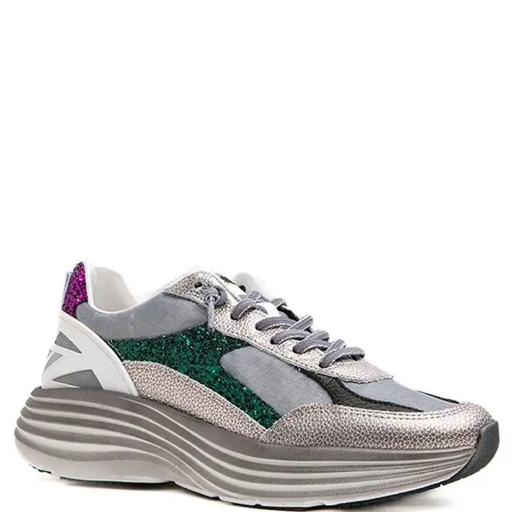 Zapatillas deportivas elaboradas en piel y glitter. Combinación en materiales y texturas. Plantilla acolchada. Suela de goma de 5 cm de altura. Cierre con cordones elásticos.