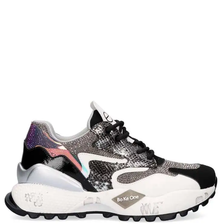 Zapatillas deportivas en combinación de materiales y texturas. Suela de goma de 4 cm de altura. Plantilla en material textil. Detalles decorativos en strass.