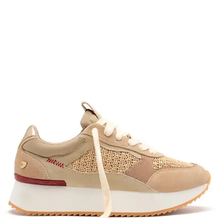 Zapatillas deportivas de piel y detalles en rafia. Plantilla anatómica extraíble y estabilizador en el talón. Suela de goma EVA con plataforma de 4 cm.