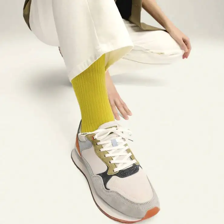 Zapatillas deportivas con cordones formada por piezas cortadas combinando diferentes materiales en diferentes tonos pastel. Rejilla en poliéster transpirable. Plantilla extraíble de memory foam. Media suela de EVA de 3 cm de altura. Patín dentado en goma transparente con imagen serigrafiada.
