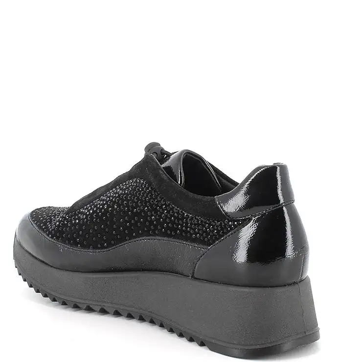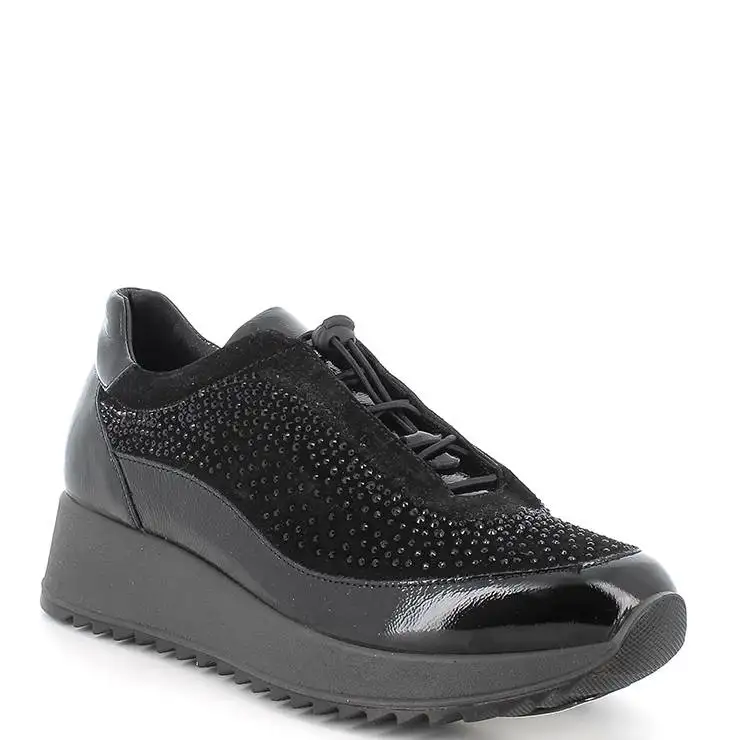 Zapatillas deportivas elaboradas en charol negro y textil con detalle de strass en negro. Cierre con cordones elásticos. Suela de goma con cuña de 4cm. Forro interior sintético y plantilla de piel.