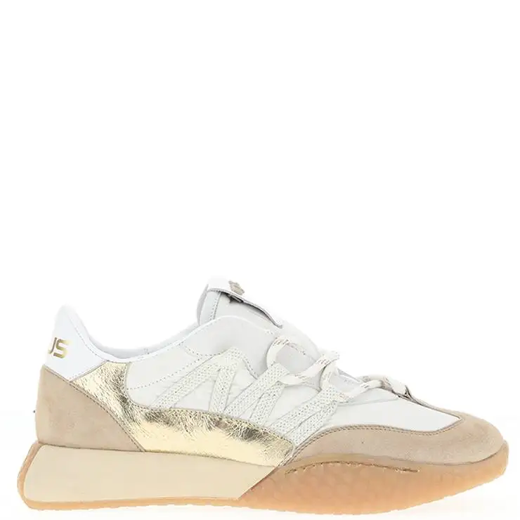 Zapatillas deportivas elaboradas en combinación de nylon, piel y ante. Detalle de cordones cruzados y lateral en piel dorada. Suela de goma bicolor.