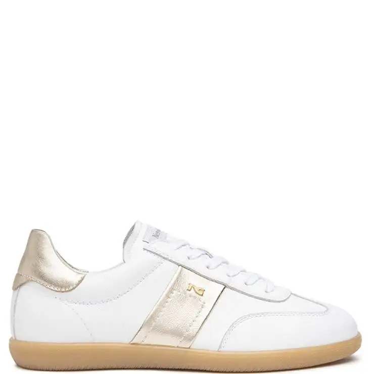 Zapatillas deportivas elaboradas en piel. Detalle de franja lateral en dorado. Suela de goma de 2 cm en color caramelo. Cierre con cordones. Plantilla extraíble.