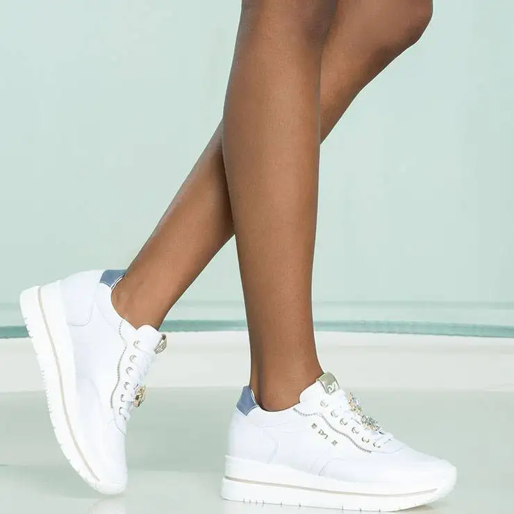 Zapatillas deportivas elaboradas en piel. Cierre con cordones. Plantilla de cuero extraíble. Suela de goma con cuña de 5 cm de altura. Detalle en piel metalizada en la parte trasera y adorno con brillantes en los cordones.