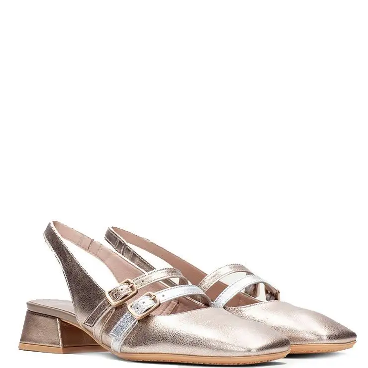 Zapato de tacón destalonado elaborado en piel. Acabado en punta cuadrada. Tacón de 3 cm de altura. Dos tiras finas paralelas con cierre de hebilla en el empeine. Tecnología Triflow, un triple almohadillado que genera un efecto acolchado en la pisada.