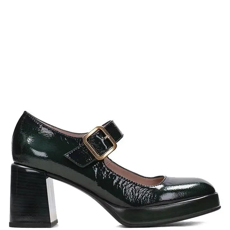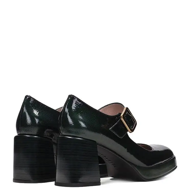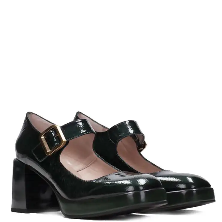 Zapato de tacón estilo mercedita elaborado en piel charol. Cierre mediante hebilla en dorado. Tecnología Triflow. Tacón en bloque de 7 cm de altura.
