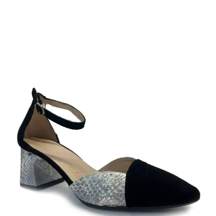 Zapato de tacón fabricado en combinacion de piel ante negro y piel estampada plata. Punta fina. Cierre con hebilla ajustable al tobillo. Cómodo tacón cuadrado de 5,5cm.