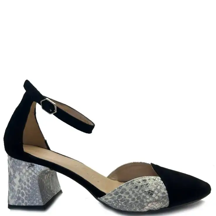Zapato de tacón fabricado en combinacion de piel ante negro y piel estampada plata. Punta fina. Cierre con hebilla ajustable al tobillo. Cómodo tacón cuadrado de 5,5cm.