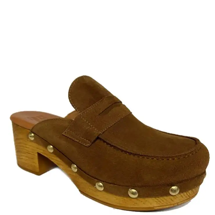 Zueco elaborado en nobuck con piso alto de madera, remaches dorados en el contorno y detalle de antifaz tipo mocasín.
