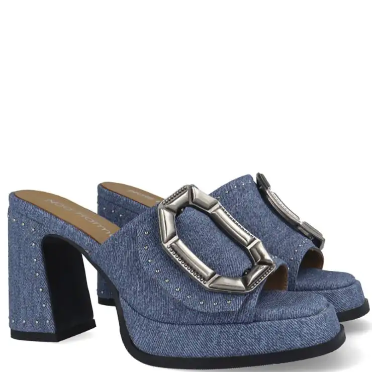 Zueco de tacón elaborado en tejido vaquero. Ajuste con maxi hebilla plateada y detalle de mini tachuelas. Suela de 2 cm de plataforma y 9 de tacón.