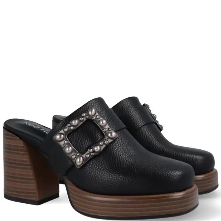 Zueco de tacón elaborado en napa grabada con maxi hebilla. Suela de madera de 2 cm de plataforma y 9 de tacón.